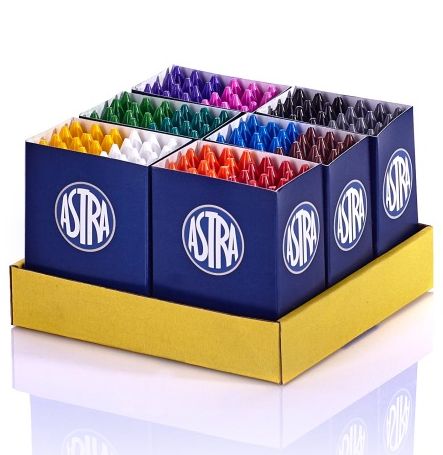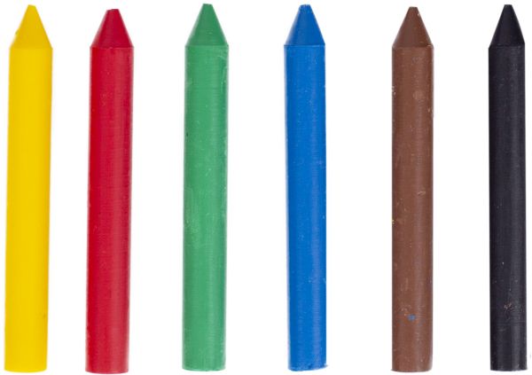 Zestaw kredek woskowych. Kolory: biały, żółty, pomarańczowy, czerwony jasny, fioletowy, różowy, niebieski ciemny, zielony jasny, zielony, brązowy ciemny, popielaty, czarny.