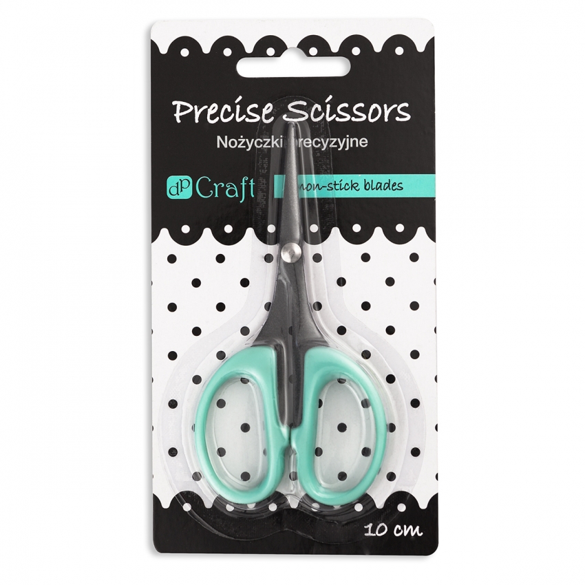 Nożyczki precyzyjne dpcraft ze stali nierdzewnej z powłoką non-stick. Polecamy do papieru, tektury, cienkiej folii, pergaminu i wielu innych materiałów. Ten wyjątkowy produkt posiada ostrza non-stick, co oznacza, że żaden materiał jak taśma dwustronna czy samoprzylepna taśma nie będzie przywierać do ich powierzchni.Świetne w precyzyjnym cięciu. Nożyczki są wyposażone w delikatny uchwyt w kolorze miętowym.