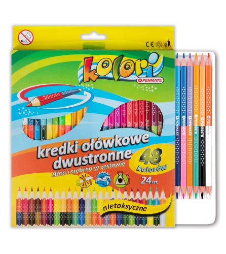 Komplet 24 szt. kredek ołówkowych dwustronnych w trójkątnej obudowie. Zestaw zawiera 48 koloróww tym srebrny i złoty. Grafit o średnicy 3 mm i zwiększonej odporności na złamania. Nowoczesna formułapigmentów dająca żywe, niegasnące kolory. Obudowa wykonana z najwyższej jakości jasnego drewnalipowego, łatwego w temperowaniu. Foliowane, trwałe pudełko z tacką na kredki w środku. Temperówkaw zestawie gratis. Nietoksyczne, zgodne z normą EN 71.