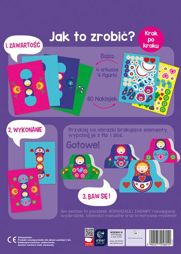Zestaw umożliwiający samodzielne stworzenie figurek, to świetna zabawa edukacyjna dla dzieci, rozwijająca wyobraźnię, zdolności manualne i kreatywne myślenie. Stwórz kolorowe matrioszki! Zestaw zawiera: 4 arkusze z elementami do stworzenia figurek oraz 73 naklejki do dekoracji obrazków.
