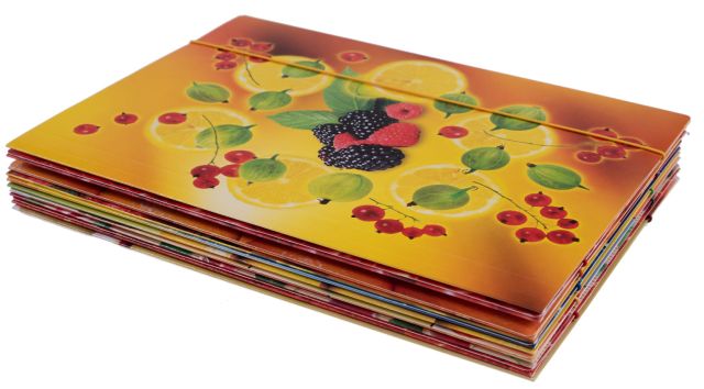 Teczka z szatą graficzną motywu owocowego wykonana jest z papieru powlekanego o gramaturze 300 g/m2. Papier zadrukowany jest klasycznym kolorowym drukiem offsetowym. Dodatkowo teczka jest lakierowana w celu uszlachetnienia i zabezpieczenia powierzchni zewnętrznej. Zamykana na gumkę. Produkt dostępny jest w 10 wzorach, na których widnieje motyw owocowy.