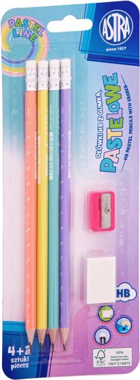 Ołówki ASTRA pastelowe HB z miarką 4szt, + gumka i temperówka blister