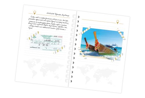 Podróżnik o wym. 159x210 mm w twardej oprawie na podwójnej spirali na magnetyczne zamknięcie. W środku znajduje się miejsce na zaplanowanie przyszłych podróży - od planu zwiedzania po kosztorys - oraz na uwiecznienie tych już odbytych. Może posłużyć za dziennik podróży. W środku znajduje się również strona tytułowa z miejscem na dane właściciela, kieszonka na luźne notatki i dokumenty, zestaw naklejek oraz mapy: Polski, Europy i świata. Podróżnik to świetny pomysł na prezent dla osoby, która często podróżuje lub po prostu kocha podróże i pragnie zatrzymać wspomnienia na dłużej.