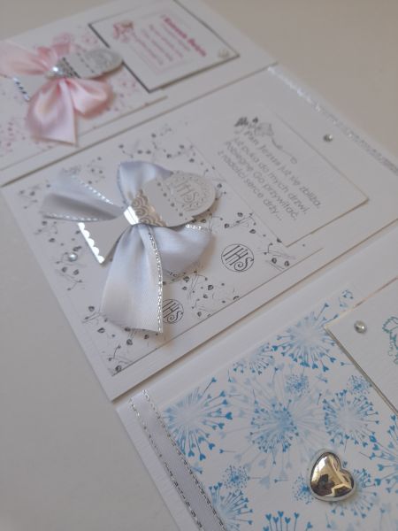 Bogato zdobiony, ręcznie wykonany karnet komunijny. Doklejane elementy, złocenia, papier premium z fakturą. Dołączone życzenia oraz koperta B6. Miks wzorów niebieskie, różowe i srebrne.