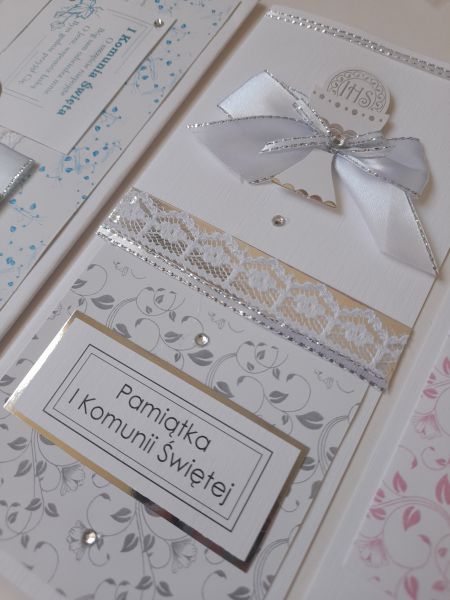 Bogato zdobiony, ręcznie wykonany karnet komunijny. Doklejane elementy, złocenia, papier premium z fakturą. Dołączone życzenia oraz koperta na wymiar kartki. Miks wzorów niebieskie, różowe i srebrne.