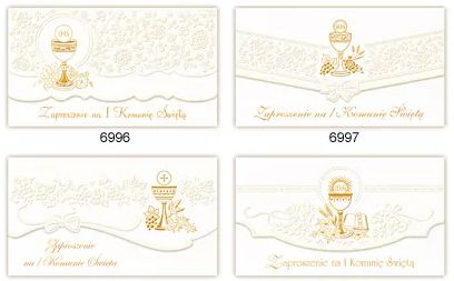 Zaproszenia na I Komunię Św. (95 x 165 mm) Perłowy tłok, złocone napisy, złocone tłoczenia Ozdobny papier, białe koperty Opakowanie 10 szt. ze wzoru WZORY DOSTĘPNE Z NAPISEM: ZAPROSZENIE DLA DZIADKA