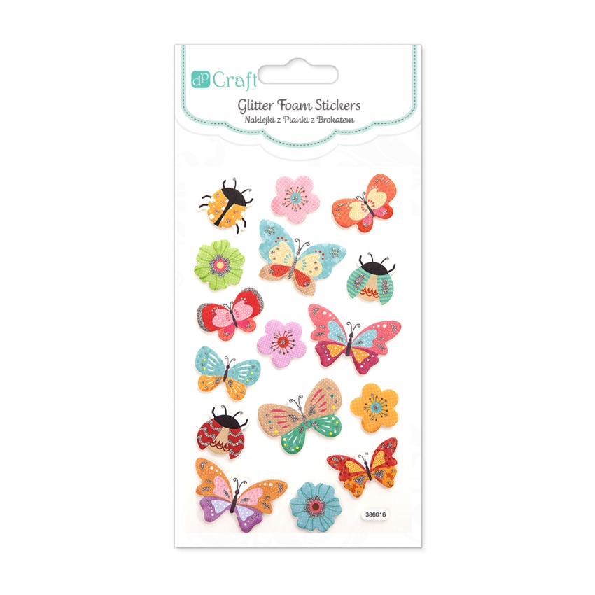 Naklejki z pianki zdobione brokatem z uniwersalnymi motywami motylków, robaczków i kwiatów.