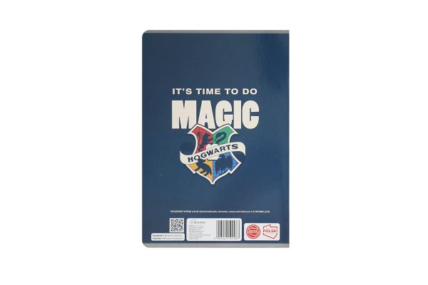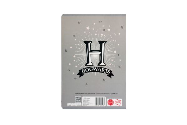 Zeszyt A5, posiada 32 kartki o gramaturze 70 g/m2 w kratkę. Charakteryzuje się estetycznym, lakierowanym wykończeniem i modną grafiką na okładce z serii Harry Potter. Na zewnętrznej stronie okładki: imiennik - miejsce na wpisanie imienia, nazwiska, klasy.