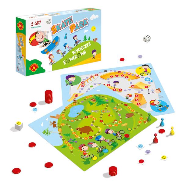 SKATE PARK to miejsce gdzie możesz się wyszaleć sprawdzając swoją sprawność i możliwości w akrobacjach na torze. Macie do wyboru jazdę na rowerze, rolkach, hulajno-dze lub deskorolce. Umiejętność wykonywania ewolucji jest zastąpiona w grze umiejętno-ścią, układania stosu z plastikowych żetonów. Ten, kto w zawodach wykaże się większą zręcznością, opanowaniem i cierpliwością zdobywając określoną liczbę żetonów zostanie zwycięzcą – jeśli przy odrobinie szczęścia ukończy jazdę bez straty wymaganych punktów. By tak się nie stało musisz uważać, by się nie przewrócić lub nie przemęczyć, bo konkurenci tylko czekają na Twój błąd.