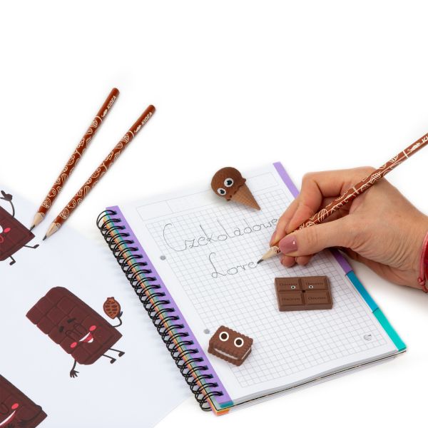 Zestaw zapachowy Kidea o słodkim, czekoladowym aromacie. Zestaw zawiera 3 ołówki o twardości rysika HB oraz trzy smakowite gumki w kształcie babeczki, czekolady i ciasteczka. Średniej twardości rysik i trójkątny kształt sprawiają, że ołówki są poręczne i wygodne w użyciu. Zapachowe gumki nie tylko słodko się prezentują, ale również precyzyjnie wymazują ołówek. Zestaw sprawdzi się zarówno na lekcji matematyki jak i plastyki, a jego czekoladowy zapach umili dzień spędzony w szkolnej ławce.