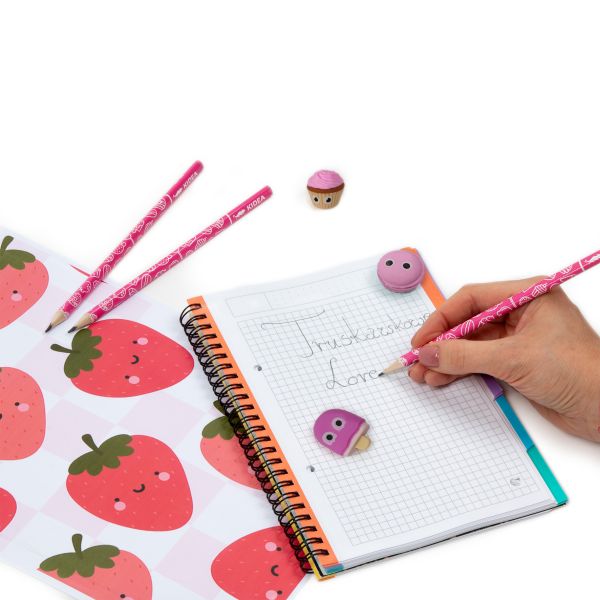 Zapachowy niezbędnik Kidea o słodkim, truskawkowym aromacie, który zawiera 3 ołówki o twardości rysika HB oraz trzy smakowite gumki w kształcie loda na patyku, makaronika i babeczki. Średniej twardości rysik i trójkątny kształt sprawiają, że ołówki są poręczne i wygodne w użyciu. Zapachowe gumki nie tylko słodko się prezentują, ale również precyzyjnie wymazują ołówek. Sprawdzi się zarówno na lekcji matematyki jak i plastyki, a jego truskawkowy zapach umili dzień spędzony w szkolnej ławce.