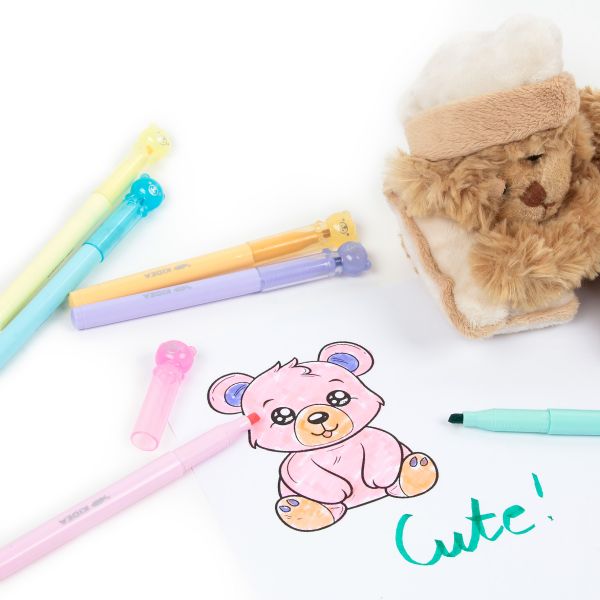 Flamastry w 6 kremowych kolorach: żółtym, brzoskwiniowym, różowym, fioletowym, niebieskim i turkusowym. Zakrętki w kształcie misiów dodają flamastrom uroku, a ich zaokrąglona końcówka idealnie sprawdza się podczas rysowania, podkreślania czy pisania. Dzięki drobnym wyżłobieniom przy końcówce, flamastry są bardzo komfortowe w użytkowaniu i wygodnie leżą w dłoni.
