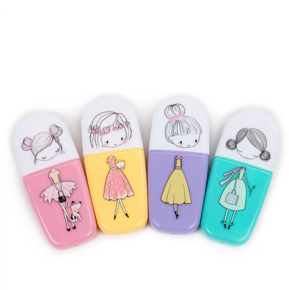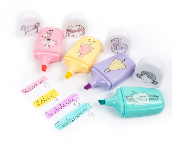 Zakre¶lacze pastelowe w czterech kolorach: ró¿owym, ¿ó³tym, fioletowym oraz turkusowym. Na ka¿dym z zakre¶laczy znajduje siê stylowa ksiê¿niczka. Zmieni±j±c zakrêtki z g³ówkami ksiê¿niczek mo¿na bawiæ siê i przebieraæ je w ró¿ne stylizacje znajduj±ce siê na zakre¶laczach, jednoczesnie nadaj±c im zupe³nie nowy look. Mini zakre¶lacze zmieszcz± siê w ka¿dym piórniku, a notatki wykonane z ich pomoc± bêd± wygl±da³y przejrzy¶cie i estetycznie, tym samym pomagaj±c w szybszym przyswojeniu wiedzy.