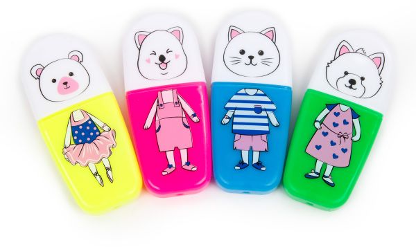Zakreślacze w czterech intensywnych, neonowych kolorach: różowym, żółtym, niebieskim oraz zielonym. Na każdym z zakreślaczy znajduje się cudaczny zwierzak. Zmieniąjąc zakrętki z główkami pupili można bawić się i przebierać je w różne stylizacje znajdujące się na zakreślaczach, jednoczesnie nadając im zupełnie nowy look. Mini zakreślacze zmieszczą się w każdym piórniku, a notatki wykonane z ich pomocą będą wyglądały przejrzyście i estetycznie, tym samym pomagając w szybszym przyswojeniu wiedzy.