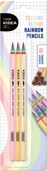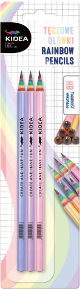 Ołówki o twardości rysika HB w błyszczących, pastelowych kolorach z teczowym zakończeniem. Ołówki kryją w swym wnętrzu sekret. Ostrząc je odkrywa się ich tęczowy środek! Idealnie nadają się zarówno do rysowania, szkicowania, jak i pisania czy liczenia, a ich wyjątkowy design przyozdobi pojemnik na przybory lub piórnik.