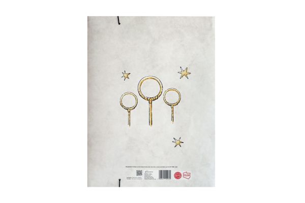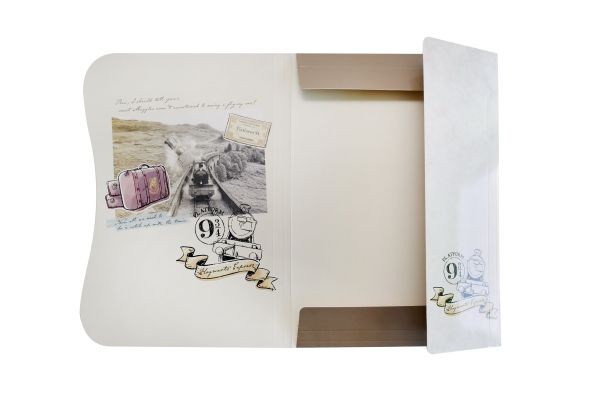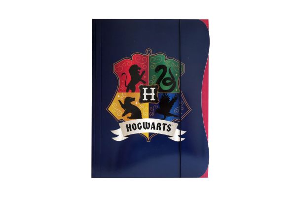 Teczka formatu A4 wykonana z grubego papieru. Zadrukowana z zewnatrz oraz wewnątrz. Wyposażona w gumkę wzdłuż długiego boku. Posiada trzy wewnętrzne klapki zabezpieczające dokumenty przed wypadnięciem. Przednia część teczki wycięta w fantazyjny kształt. Motyw z serii Harry Potter