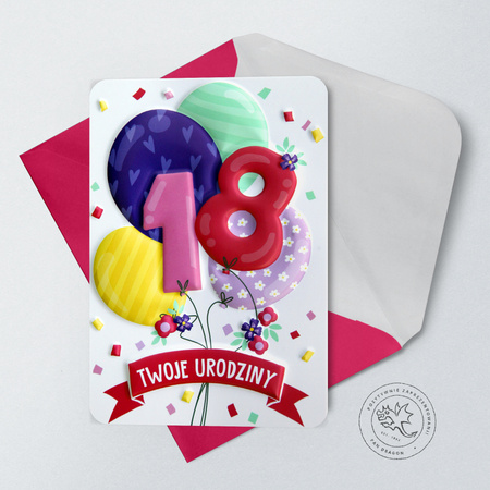 Kolorowa kartka urodzinowa z efektem 3D na froncie, idealna na świętowanie wejścia w dorosłość. Na okładce znajdują się wypukłe baloniki oraz liczba "18", co nadaje kartce wyjątkowego charakteru i przyciąga wzrok. Wewnątrz umieszczono serdeczne życzenia, a zestaw zawiera stylową kopertę. Format kartki: 13x19 cm.