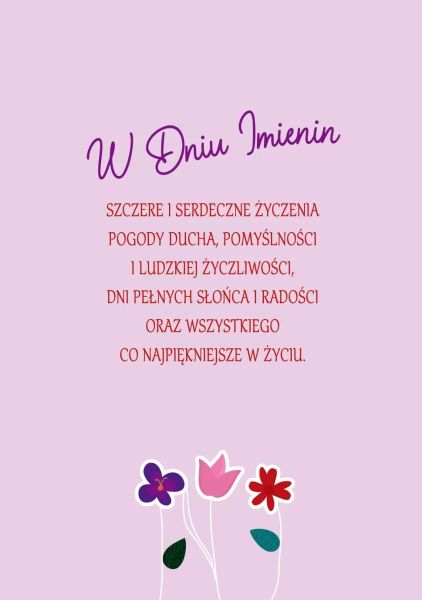 - Tekst wewnątrz: Ciepłe i serdeczne życzenia imieninowe, z miejscem na własną dedykację, by uczynić kartkę jeszcze bardziej osobistą.