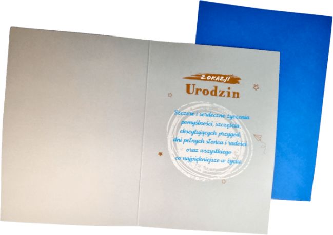 Stylowy karnet urodzinowy z wyjątkową grafiką podróżnika w górach, symbolizującą nowe przygody i piękne chwile. Zdobiony złoceniami i elementami 3D, prezentuje inspirujące przesłanie: