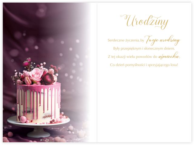 Odkryj elegancką kartkę urodzinową B6, stworzoną specjalnie z myślą o wyjątkowych solenizantkach. Bogato złocona, z kobiecymi motywami i intensywną kolorystyką, kartka zachwyca luksusowym wyglądem i dopracowanymi detalami. Na okładce znajduje się efektowny tort ozdobiony kwiatami, a wewnątrz umieszczone są piękne życzenia z kolorową grafiką.