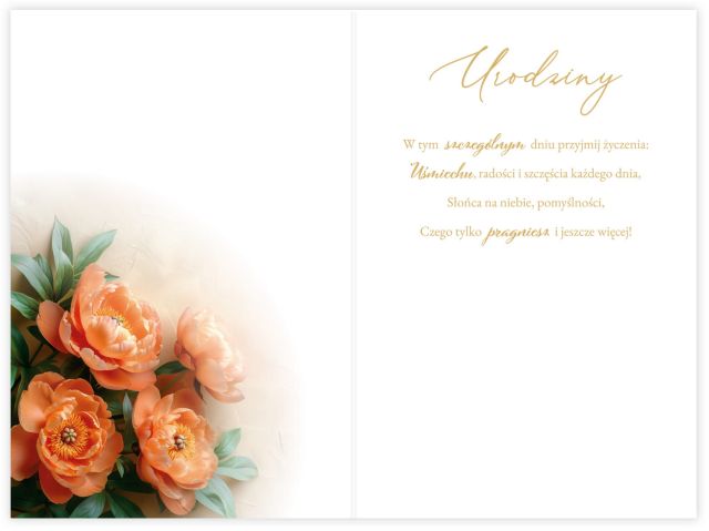 Elegancka kartka urodzinowa B6 z luksusowym złoceniem i ciepłą, pastelową kolorystyką. Motyw pięknych, pomarańczowych kwiatów na delikatnym, złocistym tle nadaje jej wyjątkowego charakteru. Zestaw wymiennych złoconych cyfr umożliwia personalizację kartki, dostosowując ją do wieku solenizanta.