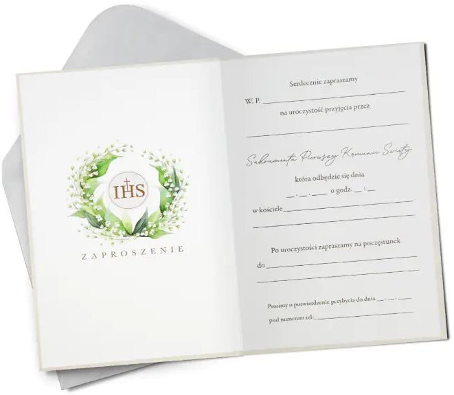 Stylowe zaproszenie komunijne z subtelnym motywem eucharystycznym i roślinnym, które podkreśla wyjątkowy charakter uroczystości. Minimalistyczny design w połączeniu z delikatną ornamentyką nadaje mu elegancji i ponadczasowego uroku.