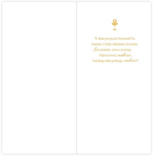 Piękna i elegancka kartka komunijna DL, zaprojektowana z najwyższą starannością, stanowi wyjątkową pamiątkę Pierwszej Komunii Świętej. Minimalistyczne, ale efektowne detale, takie jak złocenia, wypukłe elementy i ręcznie wiązana satynowa kokardka, nadają jej niepowtarzalny charakter.