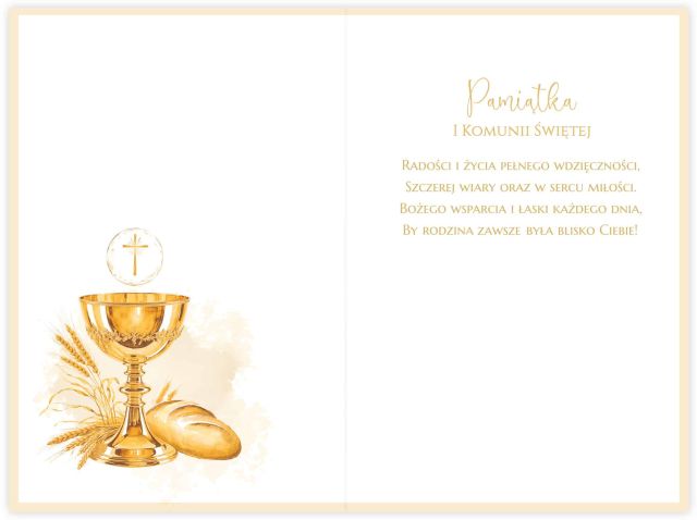 Wyjątkowa kartka okolicznościowa B6 z okazji I Komunii Świętej, zaprojektowana z dbałością o każdy detal. Centralny motyw kielicha i hostii otoczony symbolami Eucharystii – chlebem, kłosami zbóż i świeżą zielenią – nadaje kartce duchowego i eleganckiego charakteru. Złote akcenty podkreślają wyjątkowość tego dnia i sprawiają, że kartka prezentuje się niezwykle uroczyście.