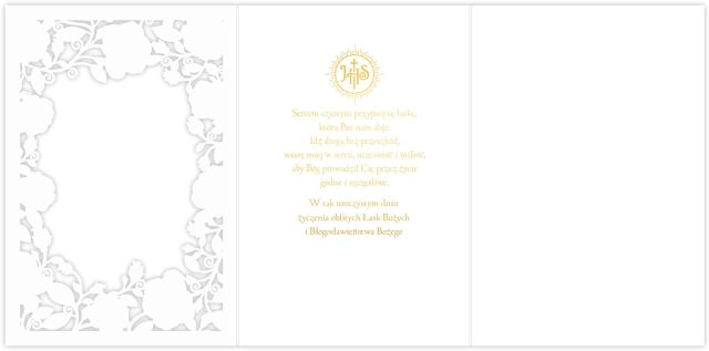 Wyjątkowa kartka LC w formacie B6, stworzona specjalnie z myślą o Pierwszej Komunii Świętej chłopca. Centralna ilustracja przedstawia skupionego chłopca w białej albie, modlącego się przed kielichem z Hostią – symboliczna i duchowa kompozycja. W tle znajduje się bogato zdobiona, laserowo wycinana rama 3D w białoniebieskim motywie kwiatowym.