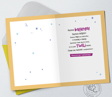 Kartka jest zdobiona opalizującą folią holograficzną, zawiera życzenia oraz kolorowy środek. W zestawie znajduje się koperta, kolorystycznie uzupełniająca się z kartką. Format złożonej kartki: B6