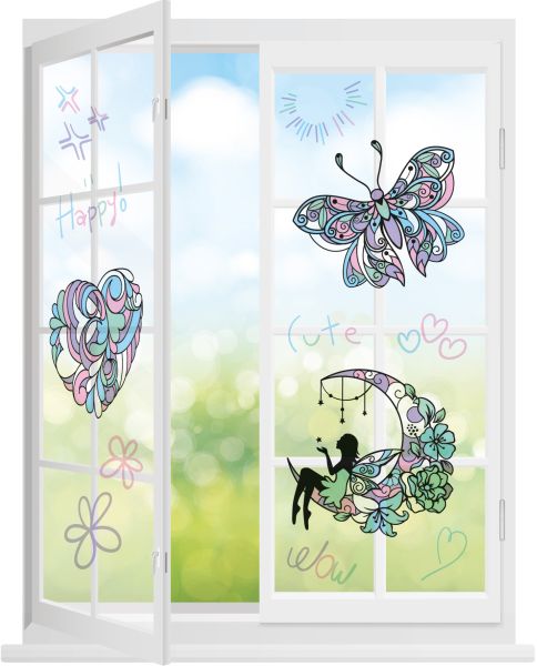 Przepiękne witraże na okno w zestawie z kolorowymi flamastrami. Adhezyjne naklejki bez użycia kleju utrzymują się na gładkiej powierzchni dzięki działaniu sił elektrostatycznych. Bez problemu można przyklejać je i odklejać bez niszczenia okna lub lustra. W opakowaniu znajdują się trzy witraże: wróżka, motylek i serce oraz cztery pisaki w pastelowych kolorach: zielonym, fioletowym, różowym i niebieskim. Umieszczając witraże na oknie uzyskamy niezwykły efekt kolorowych promieni słonecznych wypełniających pomieszczenie. Witraże na okno to nie tylko piękna dekoracja pokoju dziecięcego, ale również wyjątkowy prezent dla bliskiej osoby. Wszystkie elementy zestawu zostały umieszczone w opakowaniu na blistrze. Zawartość opakowania: - 3 x witraże do pokolorowania, - 4 x kolorowe flamastry. Wymiary opakowania: 18x26x1,5cm Wiek: 3+