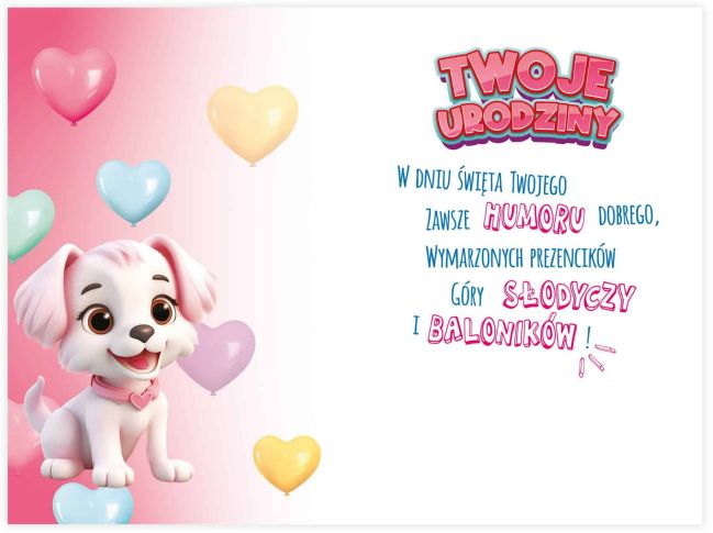 Urocza kartka urodzinowa z weso³ym bia³ym pieskiem to doskona³y wybór na drugie urodziny dla dziewczynki! Ró¿owe t³o, pastelowe baloniki i du¿a po³yskuj±ca cyfra „2” nadaj± jej bajkowego charakteru i sprawiaj±, ¿e ka¿da ma³a solenizantka poczuje siê wyj±tkowo. Kartka zosta³a wykonana z wysokiej jako¶ci papieru i ozdobiona b³yszcz±c± foli± metaliczn±, dziêki czemu piêknie siê prezentuje i stanowi wspania³± pami±tkê.