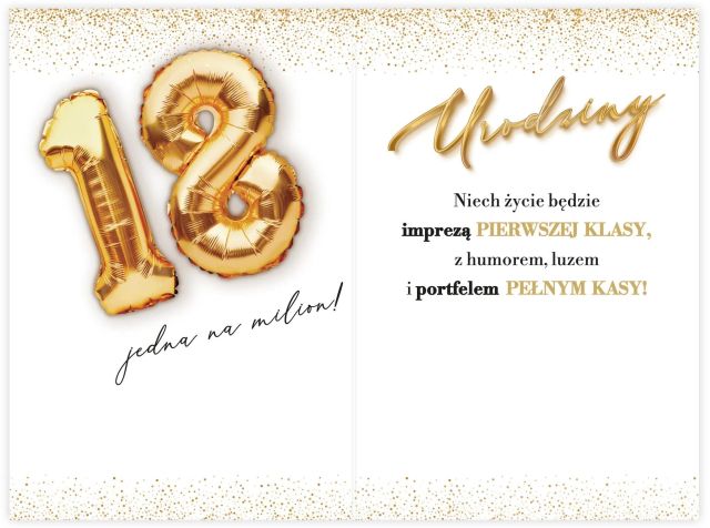 Karnet B6 „Ruszaj podbić świat!” to efektowna kartka premium z złotą cyfrą 18 w formie balonów i elegancką, celebracyjną oprawą. Luksusowy design doskonale sprawdza się jako kartka na wyjątkową osiemnastkę.