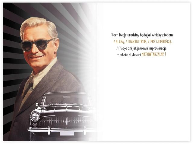 Elegancki karnet B6 z hasłem „Klasa nie zna wieku”, złoconymi detalami i klasycznym autem. Stylowa kartka urodzinowa.