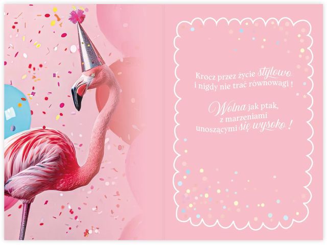 Karnet urodzinowy z różowym flamingiem w czapeczce i błyszczącej oprawie. Lekki, modny klimat i „Sto lat!” na froncie.