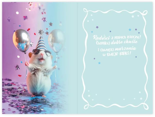 Uroczy karnet urodzinowy z chomikiem w okularach i czapeczce. Balony, konfetti, błyszcząca ramka i „Sto lat!” na froncie.