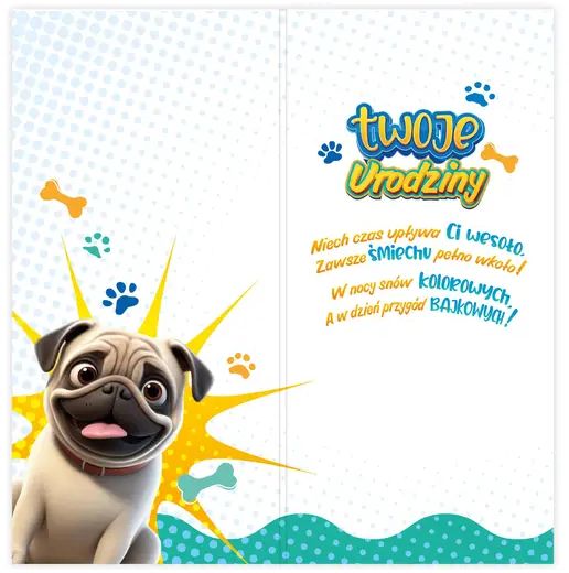 🚀 Zamów hurtowo i uzupełnij ofertę swojego sklepu o wesoły karnet „Twoje Urodziny” z mopsem.