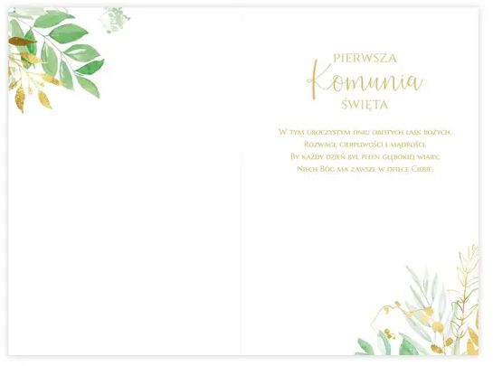 Elegancki karnet komunijny B6 LUX to wyjątkowa propozycja na Pierwszą Komunię Świętą, łącząca klasyczną symbolikę religijną z subtelną, dekoracyjną oprawą. Delikatne motywy roślinne, złocone detale oraz ozdobna kokardka nadają kartce lekkości i eleganckiego charakteru. Produkt został starannie wykonany z wysokiej jakości papieru, dzięki czemu doskonale sprawdza się jako estetyczna i gotowa do wręczenia kartka na tę wyjątkową okazję. Wewnątrz znajdują się gotowe życzenia oraz miejsce na własną dedykację.