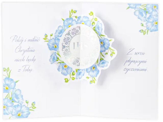 POP-UP 3D – po otwarciu kartki pojawia się przestrzenny, rozkładany element dekoracyjny.Religijna symbolika komunijna – motywy IHS, kielicha, hostii i roślinnych ornamentów podkreślają charakter uroczystości.Elegancka stylistyka premium – subtelne kolory, dekoracyjne ilustracje i staranne wykończenie budują wyjątkowy efekt wizualny.Gotowe życzenia w środku – produkt jest od razu gotowy do wręczenia.Format B6 z kopertą – praktyczny, wygodny i chętnie wybierany rozmiar kartki okolicznościowej.