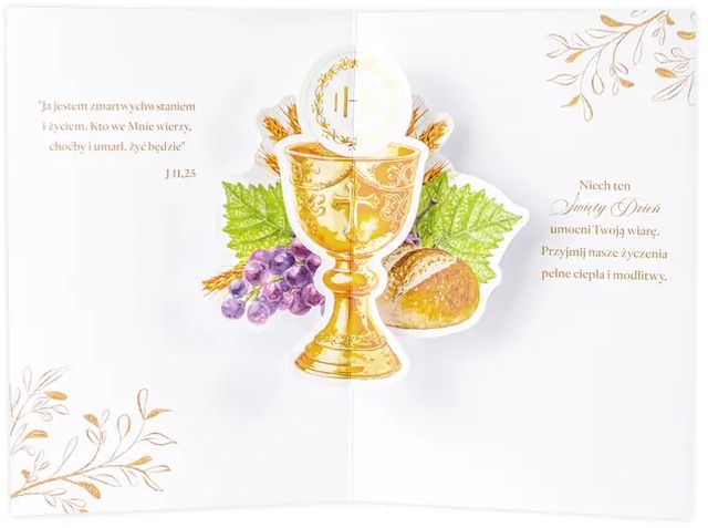 Złocenie: Subtelne, złote akcenty podkreślają uroczysty charakter wydarzenia oraz nadają kartce eleganckiego blasku.