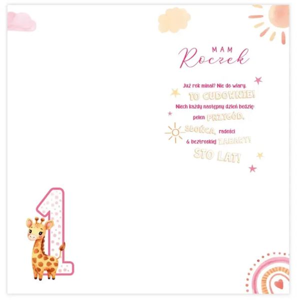 Element przestrzenny: Na pierwszym planie widnieje piękny główny element ozdobny - cyfra „1” wraz z uroczym zwierzątkiem, co dodaje kartce trójwymiarowego efektu.