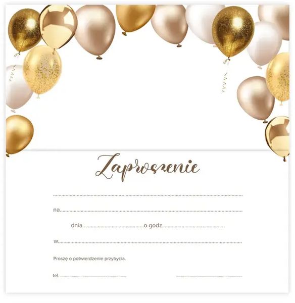 Zaproszenia na Urodziny to zestaw 10 zaproszeń uszlachetnionych złoceniem. W środku znajduje się miejsce na wypisanie wszystkich niezbędnych informacji, takich jak miejsce uroczystości czy godzina, oraz prośba o potwierdzenie przybycia.